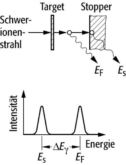 Doppler-Rückstoßmethode, Methode zur Bestimmung der Lebensdauer sehr kurzlebiger angeregter Kernzustände. Dabei wird der durch ein schwereres Projektil gebildete Kern, dessen γ-Übergänge man untersuchen möchte, nach einer bestimmten Entfernung vom Target gestoppt. Da die Energie des im Flug emittierten γ-Quants von dem nach dem Stoppen in Ruhe emittierten verschieden ist, gibt das Intensitätsverhältnis der Doppler-verschobenen zur nicht verschobenen Linie eine Information über die Lebensdauer des Zustands. Die Rückstoßgeschwindigkeit des emittierten Kerns ist aus der Reaktionskinematik bekannt, der Abstand zwischen Target und Stopper wird der zu messenden Lebensdauer angepaßt. Für kürzere Lebensdauern wählt man kürzere Abstände. Die untere Meßgrenze liegt bei Lebensdauern von 0,2 ps. Für noch kürzere Lebensdauern benutzt man die Doppler-Shift Attenuation Method.