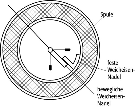 Es wird zwischen Flachspulinstrumenten und Rund- oder Ringspulinstrumenten unterschieden. Beim älteren Flachspulgerät wird ein exzentrisch gelagertes und mit einem Zeiger verbundenes Eisenplättchen in die schlitzförmige Öffnung einer Flachspule hineingezogen. Beim heute überwiegend verwendeten Rundspulgerät ist eine von zwei Eisennadeln drehbar gelagert und mit dem Zeiger, die andere fest mit der Spule verbunden. Wenn durch die Spule ein Meßstrom fließt, stoßen die Nadeln sich ab, da sie im Spulen-Magnetfeld gleichsinnig magnetisiert werden (Abb.).
