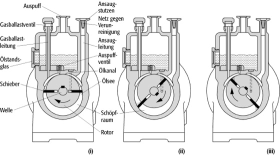 Drehschieberpumpe, eine Verdrängerpumpe mit einem exzentrisch gelagerten Rotor, der von einer Motorwelle angetrieben wird (Vakuumpumpe). In dem Rotor sind zwei oder mehr Schieber angebracht, die durch Federn oder Zentrifugalkräfte während der Rotation an die Gehäusewand gepreßt werden. Das abzusaugende Gas tritt durch den Ansaugstutzen in den sich bei der Rotation vergrößernden sichelförmigen Schöpfraum durch eine Stirnfläche ein (Abb., Stellung i). Da der Ansaugraum bei jedem Ansaugen quasi neu gebildet wird, entsteht kein schädliches Volumen. Durch die Vergrößerung des Schöpfraumes beim Drehen des Rotors kommt die Saugwirkung der Pumpe zustande. Ungefähr bei Stellung ii hat der Schöpfraum sein maximales Volumen Vmax. Beim Weiterdrehen (Stellung iii) kommt das vorher angesaugte Gas in den Verdichtungsraum, während im Schöpfraum neues Gas aus dem zu evakuierenden Behälter angesaugt wird.