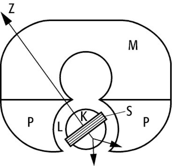 Drehspulinstrument: Aufbau des Drehspulinstrumentes. M: Dauermagnet, P: Polschuhe, L: Luftspalt, K: Weicheisenkern, S: Drehspule, Z: Zeiger.