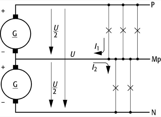 Dreileitersystem: Bei fester Verbraucherspannung verdoppelt sich die Übertragungsspannung im Vergleich zum Zweileitersystem, dadurch vervierfacht sich die übertragene Leistung. Der Mittelleiter Mp ist meist geerdet.