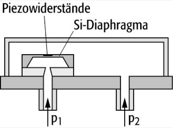 Drucksensor, Druckaufnehmer, Druckmeßfühler, Bauelement zur Messung von Drücken, das Druckänderungen in elektrische Signale umwandelt. Weit verbreitet sind Druckmeßdosen, die mit Dehnungsmeßstreifen oder kapazitiv (über die Änderung des Luftspaltes zwischen zwei Kondensatorplatten) oder induktiv (Übertragung einer Membrandurchbiegung auf den Tauchanker einer Spule) arbeiten. Daneben werden piezoelektrische Drucksensoren eingesetzt, die den piezoelektrischen Effekt ausnutzen, sowie auf dem piezoresistiven Effekt beruhende Halbleiter-Drucksensoren. Bei letzteren sind typischerweise in eine n-dotierte Siliciummembran mehrere p-dotierte Piezoelemente eindiffundiert oder implantiert, die eine Wheatstone-Brücke bilden. Bei Verformung ändert sich der elektrische Widerstand der Piezoelemente und dadurch in Abhängigkeit von dem auf die Membran wirkenden Druck die an der Brücke gemessene Spannung. (Druckmeßverfahren, Sensoren)
