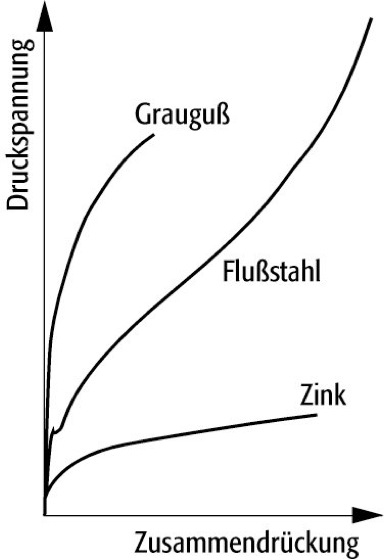 Druckversuch: Spannungs-Stauchungs-Diagramm für Grauguß, Flußstahl und Zink.