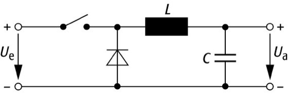 Durchflußwandler, ein Gleichspannungswandler, bei dem sowohl in der Leit- als auch der Sperrphase eines Schalttransistors ein Strom durch den Lastwiderstand fließt. Er besteht aus einem Schalttransistor, einer Diode und einer Induktivität sowie einem Kondensator als Tiefpaß zur Mittelwertsbildung. In der Leitphase wird die Induktivität aufgeladen und in der Sperrphase über die dann leitende Diode entladen. Unter der Annahme, daß der Strom durch die Induktivität nicht Null wird, ist die Ausgangsspannung Ua durch Ua = (tein/T)Ue gegeben. Ue = Eingangsspannung, tein = Dauer der Leitphase, T = Schaltperiodendauer. Es gilt daher Ua ≤ (tein/T)Ue.