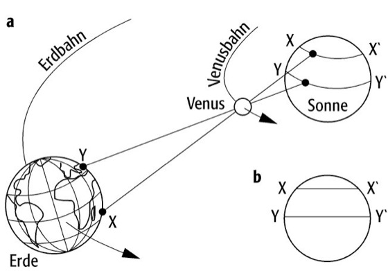 Durchgang 2: Vorübergang der Venus vor der Sonne: a) räumliche Darstellung; b) scheinbare Venusbahn von der Erde aus.