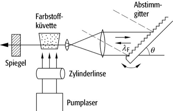 durchstimmbarer Laser, abstimmbarer Laser, ein Laser, dessen Wellenlänge innerhalb eines bestimmten Bereichs weitgehend kontinuierlich variiert werden kann und der besonders in der Spektroskopie Anwendung findet. Durchstimmbare Laser zeichnen sich durch eine breite, im wesentlichen homogen verbreiterte Verstärkungskurve aus und liefern Strahlung sowohl kontinuierlich als auch im Pulsbetrieb mit Pulsdauern bis in den ps-Bereich. Durchstimmbare Laser der verschiedenen Typen überdecken insgesamt einen Spektralbereich von 100 nm bis 32 μm. Der Wellenlängenbereich, in dem ein durchstimmbarer Laser emittiert, wird durch das Verstärkungsprofil des Lasermediums und durch den Resonator des Lasers bestimmt. Soll nur Licht eines schmalen Frequenzbereichs erzeugt werden, so muß man demnach entweder das Verstärkungsprofil oder die optischen Eigenschaften des Resonators entsprechend verändern. In den meisten Fällen (z.B. bei Farbstofflasern) kommt die zweite Methode zum Einsatz. Dabei erreicht man die Wellenlängenselektion, indem im Resonator ein drehbares Gitter oder Etalon angebracht (oder die Resonatorlänge variiert) wird (Abb.). Dadurch kann nur Licht eines schmalen Frequenzbereichs zurück in den Resonator reflektiert werden und zur induzierten Emission beitragen. Licht anderer Wellenlängen wird aus dem Resonator hinausreflektiert. Durch Drehen von Gitter oder Etalon kommen nacheinander verschiedene Frequenzen zur Rückkopplung, und die Farbe des Laserlichts kann durchgestimmt werden.