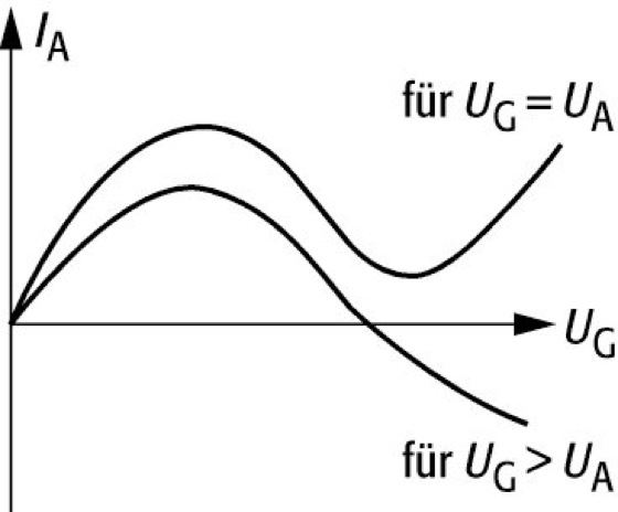 Dynatron, eine Triode unter speziellen Betriebsbedingungen, bei der in der UA-IA-Kennlinie (Anodenspannungs-Anodenstrom-Kennlinie) im Bereich positiver Anodenspannung ein Abschnitt mit negativer Steigung auftritt (Abb.), der Strom also mit wachsender Spannung abnimmt. Auf diese Weise kann ein Schwingkreis bis zur Selbsterregung entdämpft werden. Die fallende Kennlinie wird erzeugt, indem an das Gitter eine höhere positive Spannung gelegt wird als an die Anode. Die an der Anode ausgelösten Sekundärelektronen fließen dann zum Gitter, so daß der Nettoanodenstrom bei wachsender Spannung (und damit höherem Sekundärelektronenfluß) abnimmt. Eine analoge Kennlinie ergibt sich bei einer Pentode zwischen Anode und Schirmgitter, wenn das Bremsgitter ausgeschaltet wird.