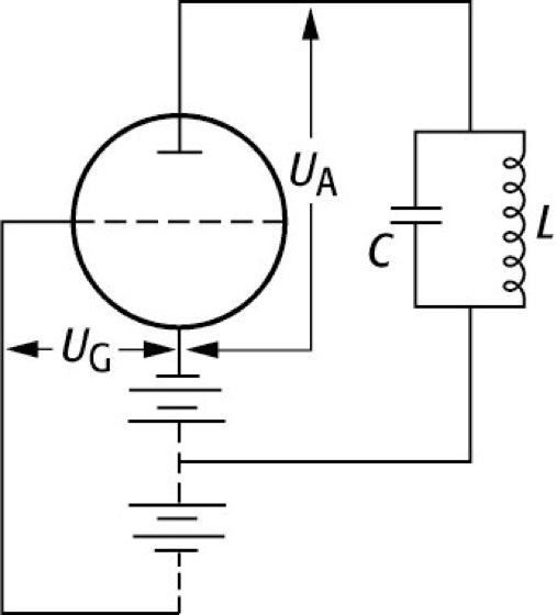 Dynatron: Dynatron-Schaltung, a) UAIA -Kennlinie, UG: Gitterspannung; b) Schaltbild mit entdämpftem Schwingkreis.