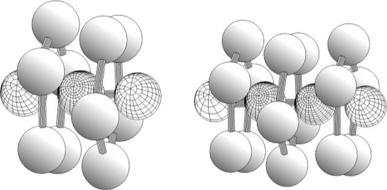 Edelgascluster: Modell geladenener Edelgasclusters mit 13 bzw. 19 Atomen. Die neutralen Atome gruppieren sich in Ringen um das linear angeordnete, geladene Chromophor aus drei bzw. vier Atomen.