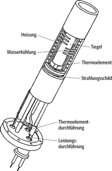 Effusionszelle, Gerät zum Verdampfen der Quellenmaterialien in der Molekularstrahlepitaxie bzw. bei der Herstellung dünner Schichten im Ultrahochvakuum. Sie besteht aus einem Tiegel (meist aus pyrolytischem Bornitrid (PBN)), in dem das Quellenmaterial in fester Form eingelagert ist. Der Tiegel wird von einem Heizdraht umgeben und ist zur Temperaturbestimmung mit einem Thermoelement versehen. Die ganze Zelle ist zur thermischen Isolierung von einer Wasserkühlung umgeben (Abb.). Man benutzt heute im wesentlichen Langmuir-Zellen, d.h. Zellen mit großer Öffnung, die im Gegensatz zur Knudsen-Zelle nicht im thermodynamischen Gleichgewicht arbeiten. Alle in einer Effusionszelle verwendeten Materialien müssen einen sehr niedrigen Dampfdruck bei Betriebstemperaturen bis ca. 1400 °C haben und dürfen nicht mit dem Quellmaterial reagieren. Die Herstellung qualitativ guter Schichten erfordert reproduzierbare Temperatureinstellungen mit einer Genauigkeit von bis zu 0,1 °C bei ca. 1000 °C Betriebstemperatur. Eine Sonderform der Effusionszelle ist die sog. Cracker-Zelle, die molekular verdampfende Quellmaterialien, z.B. As in der III-V-MBE, in einer Zone mit erhöhter Temperatur zerlegt. In der Si-MBE werden häufig Effusionszellen verwendet, in denen die Verdampfung des Quellmaterials durch Elektronenbeschuß erfolgt.
