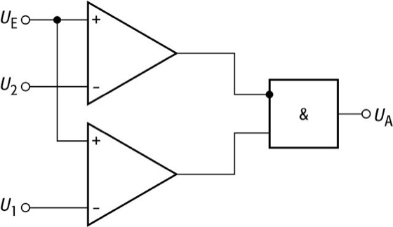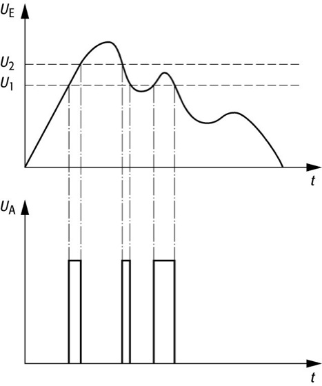 Einkanal-Diskriminator 1: Prinzip-Schaltbild. UE: Eingangssignal, U1 und U2: untere und obere Schwelle, UA: Ausgangssignal.