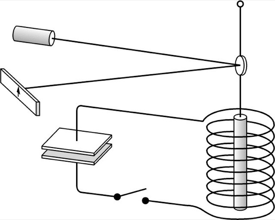 Einstein-de-Haas-Versuch: Schematischer Versuchsaufbau des Einstein-de-Haas-Versuchs. Ein Eisenstab hängt in einer Spule an einem Torsionsfaden, dessen Drehbewegung mit einem Drehspiegel und einem Laserstrahl gemessen wird.