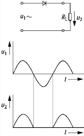 Einweggleichrichtung, einfachste Schaltung eines Gleichrichters mit nur einer Diode. Bei der Einweggleichrichtung wird jeweils nur eine Halbwelle durchgelassen. Gegenüber der Zweiweggleichrichtung sind daher der Gleichstrominnenwiderstand und der Aufwand für die Glättung höher.