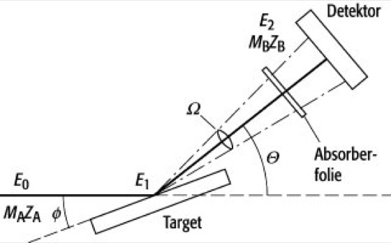 elastische Rückstreuanalyse 1: Schematische Darstellung der elastischen Rückstreuanalyse zum Nachweis leichter Teilchen. Das Projektil besitzt die Masse MA, die Kernladungszahl ZA und die Energie E0. Das Ejektil besitzt die Masse MB, die Kernladungszahl ZB und die Energie E1 bzw. nach Passieren der Absorberfolie die Energie E2. Der Kippwinkel ist φ, der Detektorwinkel Θ und der Detektoröffnungswinkel Ω.