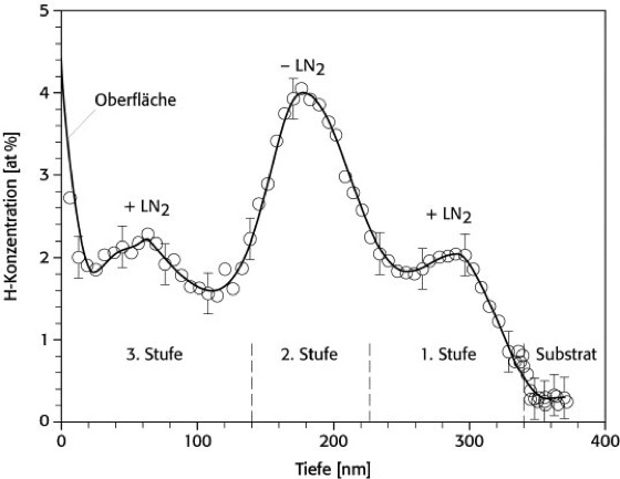 elastische Rückstreuanalyse 2: ERD-Analyse zur Bestimmung der Wasserstoff-Konzentrationsverteilung in PVD-Siliciumnitridfilmen. Gezeigt ist der Restgaseinfluß während der Filmherstellung auf die H-Konzentration.