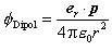 elektrischer Dipol, eine Verteilung elektrischer Ladungen ρ(x), deren nulltes Moment, die Gesamtladung, verschwindet, deren Dipolmoment jedoch von null verschieden ist (Multipolentwicklung). Im einfachsten Fall besteht ein elektrischer Dipol aus einer positiven und einer gleich großen negativen PunktladungQ im Abstand d. In diesem Fall ist das elektrische Dipolmomentp = Q · d. Das Potential eines elektrischen Dipols im Ursprung ist (mit er als Einheits-Ortsvektor):