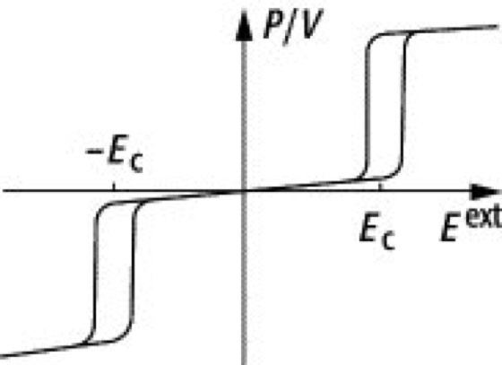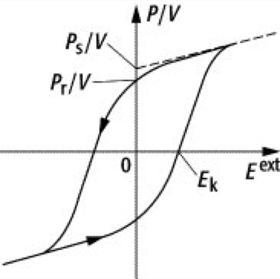 Elektrisierungskurve 1: Hystereseschleife eines Ferroelektrikums. Ps / V = Spontanelektrisierung, Pr / V = Remanenz, Ek Koerzitivfeld.