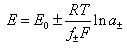 (E0: Normalpotential, R: allgemeine Gaskonstante, T: absolute Temperatur, F: Faraday-Konstante, f±, a±: Wertigkeit und Aktivität der Kationen bzw. Anionen).