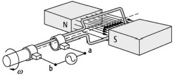 Elektromotor 1: Legt man an eine Generatorspule eine Wechselspannung der Frequenz ω an, so wird der Generator zum Motor.