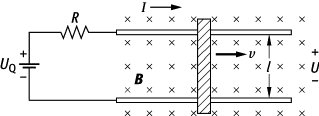 Elektromotor 2: Ein einfacher elektrischer Motor in Form eines Metallstabes, der auf Metallschienen mit der Geschwindigkeit v gleitet, in einem Magnetfeld B. An die Schienen ist eine Gleichspannungsquelle der Spannung UQ über einen Widerstand R angeschlossen, die einen Strom der Stärke I erzeugt.