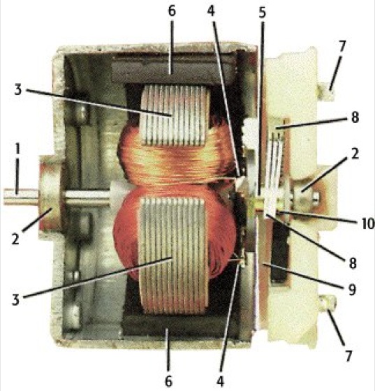 Elektromotor 4: Motor eines Rennwagens für eine Modellrennbahn, bei dem die obere Gehäusehälfte entfernt wurde. Die Achse (1) läuft in Lagern (2), die sich auf der rechten und linken Seite befinden. Der Anker besteht aus zwölf dünnen Plättchen (3) aus leicht magnetisierbarem Material, die miteinander verklebt sind. Die Plättchen sind so geformt, daß drei Nuten und drei Pole entstehen. Die Schlitze sind so groß, daß viele Windungen Platz finden. Die gesamten Windungen um einen Pol nennt man eine Wicklung. Die Wicklungsenden sind miteinander verlötet (4) und mit den Kommutatorsegmenten verbunden (5). Im Gehäuseinnern sind Permanentmagnete angebracht (6), die das Statorfeld erzeugen. An die äußeren Anschlüsse (7) wird eine Spannung angelegt. Der Strom fließt durch die obere haarnadelförmige Bürste (8). Von dort fließt er weiter zum oberen Kommutatorsegment, durch die Verbindungsleitungen und über das untere Kommutatorsegment (9) zurück zur Spannungsquelle. Die einzelnen Kommutatorsegmente sind gegeneinander isoliert (10). Man kann die Funktion des Motors durch zwei unterschiedliche Ansätze beschreiben: Entweder erklärt man das Motordrehmoment durch die Wechselwirkung des Ankerstroms mit einem stehenden Magnetfeld, oder man führt das Motordrehmoment auf die Wechselwirkung der feststehenden Magneten mit den wechselnden magnetischen Polen, die der Strom in den Ankerwicklungen erzeugt, zurück. Eine sorgfältige Analyse zeigt, daß beide Ansätze im Grunde gleich sind.