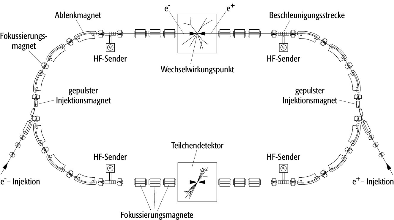 Der Elektron-Positron-Speicherring besteht aus zwei mit Ablenk- und Fokussierungsmagneten bestückten Halbbögen, die durch längere gerade Strecken getrennt sind, in deren Mitte jeweils ein Kollisionspunkt (auch Wechselwirkungspunkt genannt) der umlaufenden Teilchenstrahlen liegt. Jeder dieser Kollisionspunkte ist von einem entsprechend der physikalischen Aufgabe konzipierten Teilchendetektor umgeben.