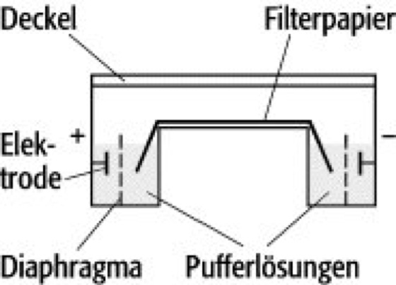 Elektrophorese: Trägerelektrophorese auf Papier. Die Enden des mit einem Leitelektrolyten getränkten Papierträgers tauchen in Pufferlösungen ein. Die Elektrodenspannung beträgt mindestens 100 V.