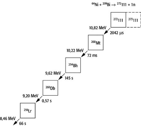 Element 111: Die Zerfallskette, mit der die beiden Isotope des Elements Z = 111 mit den Massenzahlen A = 272 und 273 erstmals nachgewiesen und identifiziert wurden.