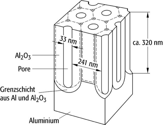 Die Anodenvorgänge sind relativ komplex. Es bildet sich Sauerstoff, der, statt zu entweichen, direkt beim Entstehen mit der Anode reagiert und so die Aluminiumoberfläche mit einer porig aufgelockerten Oxidschicht (Abb.) überzieht: