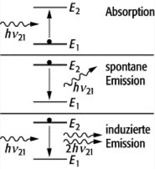 Befindet sich ein Teilchen im Zustand 2 im Strahlungsfeld einer elektromagnetischen Welle der Frequenz ν21, so kann diese Welle die Relaxation in den Zustand 1 unter Emission eines weiteren Lichtquants der Frequenz ν21 bewirken. Dies nennt man induzierte Emission. Das emittierte Photon entspricht in Frequenz, Phasenlage, Polarisation und Ausbreitungsrichtung dem induzierenden Photon. Für die Änderung der Teilchenzahlen im angeregten Zustand 2 gilt entsprechend bei induzierter Emission