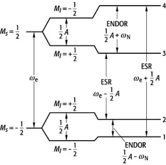 ENDOR, Electron Nuclear Double Resonance, Doppelresonanz-Experiment zwischen Elektronen- und Kernspins: Ein Elektronenspinresonanzübergang wird durch Mikrowelleneinstrahlung zumindest teilweise gesättigt. Durch gleichzeitige Einstrahlung eines Radiofrequenzfelds, dessen Frequenz langsam durchgestimmt wird, kann der Kernspinresonanzübergang der Kerne, die mit den angeregten Elektronen gekoppelt sind, ebenfalls gesättigt werden. Dadurch verändern sich die Relaxationsmöglichkeiten der mit dem Mikrowellenfeld angeregten Elektronen durch Polarisationstransfer zu den angeregten Kernen, und die Amplitude der teilweise gesättigten ESR-Linie erhöht sich. Diese Veränderungen der ESR-Amplitude können gemessen werden und bilden das ENDOR-Signal. Die ENDOR-Spektroskopie erlaubt die Messung der Wechselwirkungstensoren der Hyperfeinaufspaltung und der Superhyperfeinaufspaltung. ENDOR-Spektren sind wesentlich einfacher zu analysieren als die Hyperfeinlinienaufspaltung in ESR-Experimenten, da sie bei N an der Hyperfeinaufspaltung beteiligten Kernen nur (2N + 1) anstelle von 2N Linien aufweisen.