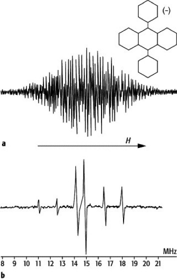 ENDOR 3: Vergleich von a) ESR- und b) ENDOR-Spektrum des einfach negativen Diphenylanthracen-Ions.