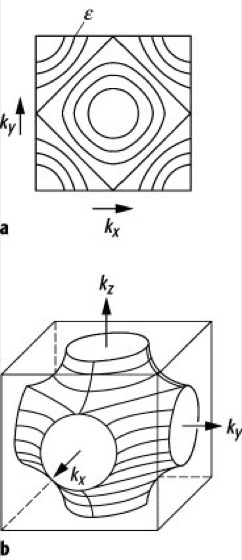Energiefläche: Kurven konstanter Energie in der kxky-Ebene der 1. Brillouin-Zone eines kubisch primitiven Gitters (a) und eine Energiefläche im k-Raum (b).