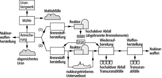 Entsorgung radioaktiver Abfälle, Verbringung schwach- oder hochradioaktiver Abfälle in Zwischen- und Endlager oder in Wiederaufbereitungsanlagen. Radioaktiver Abfall ensteht bei der Herstellung von Nuklearwaffen, beim Betrieb kommerzieller Kernkraftwerke (Energietechnik), bei der Herstellung und Wiederaufarbeitung von Kernbrennelementen (Brennelemente), beim Uranbergbau sowie in der Nuklearmedizin. Neben der Aktivität der Abfallstoffe spielen für ihre Klassifizierung (Abfall, radioaktiver) und Entsorgung die Halbwertszeiten der Inhaltsstoffe eine wichtige Rolle. Während das Gefährdungspotential der Mehrzahl der Spaltprodukte eines Kernreaktors nach größenordnungsmäßig 1000 Jahren auf die Aktivität natürlicher Uranvorkommen abgesunken ist, ist dies bei den Actinoiden erst nach > 1 Mio. Jahren der Fall. Die Abfallstoffe müssen daher für geologische Zeiträume sicher von der Biosphäre abgeschlossen werden. Das Entsorgungskonzept in der Bundesrepublik Deutschland sieht eine direkte Verbringung in tiefe geologische Formationen vor, wobei für Stoffe mit geringer Wärmeentwicklung die ehemalige Eisenerzgrube Konrad (Salzgitter) sowie das ehemalige DDR-Endlager Morsleben dienen sollen (Abb. 3). Für alle anderen radioaktiven Abfälle, vor allem aber die hochaktiven, ist der Salzstock in Gorleben vorgesehen. Insbesondere die Wahl Gorlebens ist seit Jahren Gegenstand heftiger politischer Auseinandersetzungen. Spezifische Entsorgungskosten werden für den Schacht Konrad mit 10 000 DM/m3 Abfall sowie für Gorleben mit 600 000 DM/m3 Abfall angegeben. Vor der Einbringung in ein dauerhaft zu verschließendes Endlager werden die hochaktiven Abfälle zunächst einige Jahrzehnte intern in den Kernkraftwerken oder in externen Zwischenlagern bis zum Abklingen der Radioaktivität der kürzerlebigen Isotope zwischengelagert. Weltweit wird die Endlagerung hochaktiver Abfälle in tiefen geologischen Formationen wie Granit, Salz, Ton oder Tuff favorisiert; andere diskutierte Alternativen wie die Versenkung auf dem Meeresgrund oder die Vergrabung in natürlichen oder künstlichen Inseln unterhalb des Meeresspiegels werden z.Z. nicht verfolgt. Eines der größten Probleme bei der direkten Endlagerung besteht in den extrem langen Halbwertszeiten der Actinidenelemente (vor allem Isotope von U, Np, Pu, Am) sowie einiger Spaltprodukte wie 99Tc oder 129J. Daher wird z.Z. die Abtrennung dieser Isotope (Partioning) mit anschließender Umwandlung in kürzerlebige Isotope (Transmutation) mit Hilfe von Neutronenbeschuß untersucht. So kann etwa 240Pu mit einer Halbwertzeit von 6550 a über die Reaktion