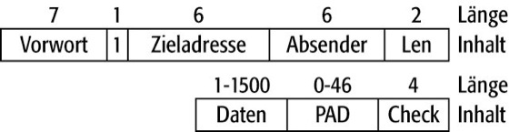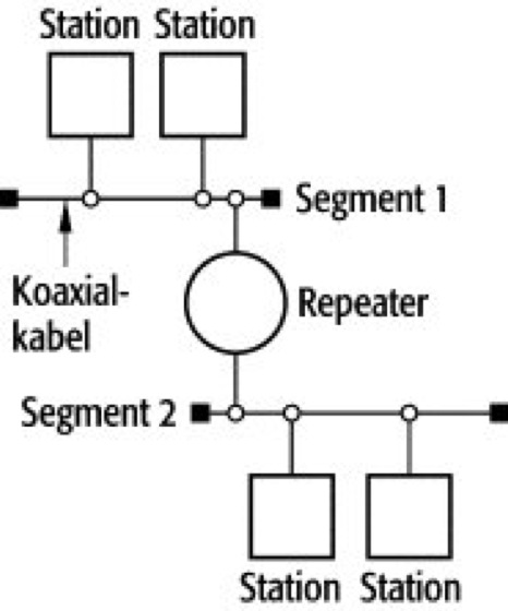 Die Adressierung der Daten erfolgt in einem speziellen Format, den Ethernetpaketen (Abb. 1). Das 7 Byte breite Vorwort, das den Inhalt 10101010 hat, dient zur Synchronisation der Empfangsuhr. Das Zieladressfeld beginnt mit einem ersten Bit, das angibt, ob es sich bei der Zieladresse um eine Einzeladresse oder einer Vielfachadresse handelt. Im darauffolgenden Längenfeld steht die Zahl der Bytes der anschließenden Nachricht (0 bis 1500). Damit die Gesamtlänge des Paketes nicht 64 Byte unterschreitet, schließt sich wenn notwendig ein sog. PAD-Feld an. Die letzten 32 Bit des Paketes dienen zum Konsistenztest (CRC, Cycle Redundancy Check), um Fehler aufzudecken und zu korrigieren. Die Übertragungsgeschwindigkeit beträgt 10 Mbit/s, die Bitdarstellung erfolgt in der störungsunanfälligen Manchestercodierung. Nachteilig ist, daß das Ethernet keine Prioritäten bei der Datenübertragung erlaubt, so daß dringliche Signale nicht schneller als unwichtige Daten übertragen werden. Eine typische Ethernet-Topologie besteht aus einem maximal 500 m langen Koaxialkabel mit maximal 100 Transceiver-Anschlüssen (Stationen). Das Transceiver-Kabel darf dabei nicht länger als 50 m sein. Ein solches Basissegment kann mit einem Repeater an ein weiteres Segment angeschlossen werden (Abb. 2).