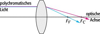 Farbortsfehler, Farblängsfehler, Farbschnittweitenfehler, Abbildungsfehler erster Ordnung, der im Paraxialgebiet bei der Abbildung von Achsenpunkten mit polychromatischem Licht auftritt. Strahlen mit verschiedenen Wellenlängen werden aufgrund der Dispersion in optischen Materialien unterschiedlich stark gebrochen und schneiden daher die optische Achse in unterschiedlichen Schnittweiten a, wobei die Ablenkung zu kürzeren Wellenlängen hin zunimmt, d.h. blaues Licht wird stärker als rotes Licht gebrochen (s. Abb. 1, Abb. 2). Die Größe des Fehlers