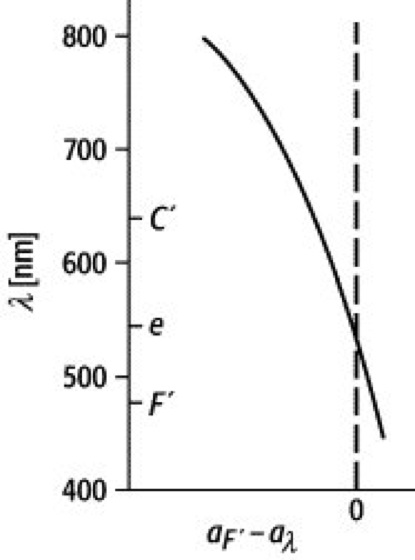 (F′ = 480 nm und C = 642,8 nm) ist abhängig von der Linsenform (eine Konvexlinse zeigt eine Unterkorrektion, eine Konkavlinse dagegen eine Überkorrektion), der Brennweite f und der Stellung der Linse im Strahlengang. Der Farbortsfehler ist gegeben durch