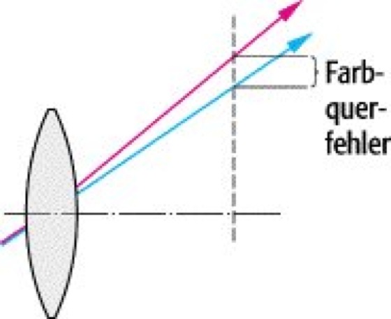 Farbquerfehler, Farbfehler des Hauptstrahles, optischer Abbildungsfehler, der auf dem Hauptstrahl bei der Abbildung außeraxialer Punkte mit polychromatischem Licht auftritt und seine Ursache im Farbortsfehler der Pupillenabbildung hat (Abb.). Der Farbquerfehler führt zu Farbsäumen und kann bei großen Bildwinkeln und hohen Ansprüchen das Bild stören.