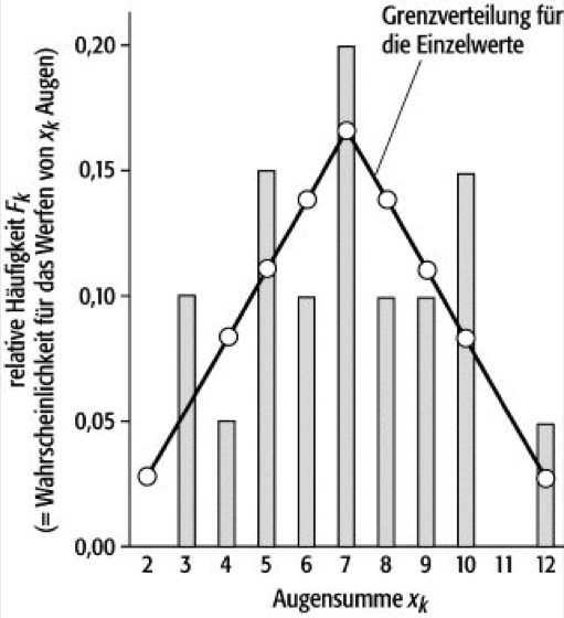 Das Beispiel zeigt im linken Diagramm die beim Wurf mit zwei Würfeln bei N = 20 Würfen erzielten Augenzahlen. Die eingezeichnete Linie ist die berechnete Wahrscheinlichkeit. Sie ist gleich der bei unendlich vielen Versuchen erzielten Häufigkeitverteilung (= Grenzverteilung für die Einzelmessung).