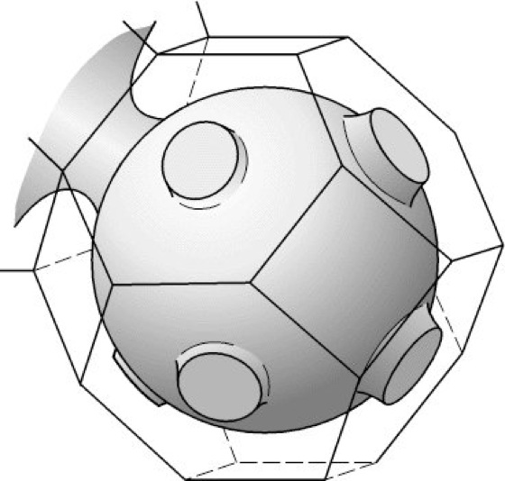 Fermi-Fläche, Fläche eines Elektronensystems im Impuls-bzw. k-Raum, auf der die Energie E(k) der Elektronen den Wert der Fermi-EnergieEF annimmt. Im Fall freier Elektronen nimmt die Fermi-Fläche die Form einer Kugeloberfläche an (Fermi-Kugel). Im periodischen Potential eines Kristallgitters jedoch ist E(k) im allgemeinen richtungsabhängig, was eine Deformation der Kugelgestalt zur Folge hat. Schneidet die Fermi-Fläche eine der Brillouin-Zonen, so kann man zeigen, daß die Fermi-Fläche senkrecht auf der Randfäche der Brillouin-Zone stehen muß. Teilstücke der Fermi-Fläche einer höheren Brillouin-Zone können durch Verschiebung entlang eines Gittervektors in die erste Brillouin-Zone projiziert werden und bilden geschlossene Teilflächen. Diese gehören i.a. unterschiedlichen Elektronenbändern (Bandstruktur) an. Die Fermi-Fläche hat deshalb oft eine komplizierte Topographie (Abb.). Experimentell kann diese durch Messung der De-Haas-van-Alphen-Oszillationen bestimmt werden.