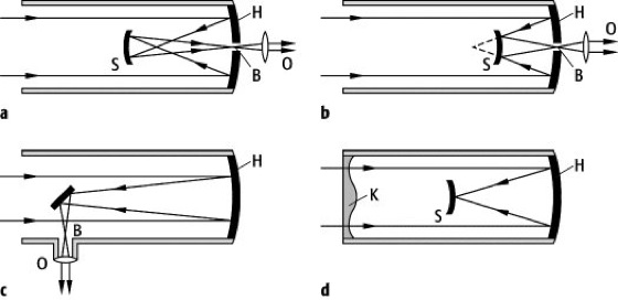 Spiegelfernrohre bestehen aus einem Hohlspiegel als Objektiv, der ein reelles, umgekehrtes und verkleinertes Bild erzeugt, das mit der Okularlupe betrachtet wird. Ihr Vorteil liegt darin, daß Spiegel im Gegensatz zu Linsen keine Farbfehler aufweisen. Je nach Okularanordnung im Strahlengang unterscheidet man zwischen dem nach Cassegrain, Gregory, Newton und Schmidt benanntem Fernrohr (Abb. 2). Beim Gregory-Fernrohr werden die durch den Hohlspiegel H erzeugten Strahlen durch einen zweiten kleinen Konkavhohlspiegel S in der Öffnung des Hohlspiegels im Bildpunkt B vereinigt und dieser mit dem Okular O betrachtet. Beim Cassegrain-Fernrohr wird der Konkavhohlspiegel durch einen konvex geformten ersetzt. Bei den Anordnungen nach Newton und Schmidt vermeidet man das Durchbohren des Hohlspiegels H. Beim Newtonschen Fernrohr werden die vom Hohlspiegel kommenden Strahlen über einen Planspiegel seitlich abgelenkt, der so entstehende Bildpunkt wird über das Okular betrachtet. Das Schmidt-Fernrohr hat eine Korrektionsplatte K, die es ermöglicht, die sphärischen Abbildungsfehler bei Spiegeln mit großem Durchmesser zu korrigieren. Der Querschnitt der Platte, die im Krümmungsmittelpunkt der Spiegelfläche steht, muß so gestaltet sein, daß die Schnittweite der Randstrahlen im Vergleich zu der der Zentralstrahlen relativ vergrößert wird. Dadurch wird der Hohlspiegel in seiner Wirkungsweise dem Parabolspiegel angeglichen.