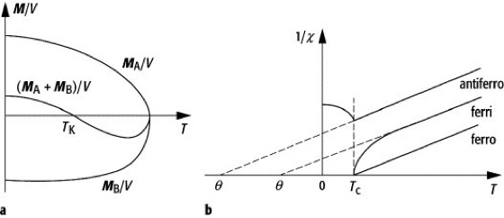 Ferrimagnetismus, eine Form von Magnetismus in Festkörpern mit einer Spontanmagnetisierung unterhalb der Curie-TemperaturTC ähnlich dem Ferromagnetismus. Durch die ferrimagnetische Ordnung sind die Spontanmagnetisierungen MA und MB der Untergitter A bzw. B entgegengerichtet, so daß es in einigen Ferrimagnetika sogar zu einer Richtungsumkehr der Gesamtmagnetisierung M = MA + MB bei einer Kompensationstemperatur Tk mit M(Tk) = 0 kommen kann (Abb. a). Im Spezialfall gleicher Magnetisierungen der Untergitter wird Antiferromagnetismus beobachtet. Die Molekularfeldnäherung ergibt für den Curie-Punkt