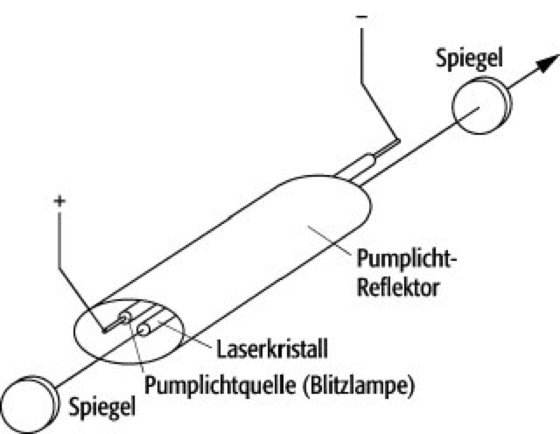 Festkörperlaser, Laser mit einem laseraktiven Medium im festen Aggregatzustand (Kristall oder Glas). Hierbei handelt es sich meist um kleine Quader oder Zylinder mit Abmessungen im Millimeter- bis Zentimeterbereich, die mit Ionen der Übergangsmetalle oder Seltenerdmetalle dotiert sind (Abb.). Die Laserübergänge finden bei den dotierten Ionen zwischen den inneren, ungefüllten Elektronenschalen statt. Deren Energieniveaus werden durch den Einbau in die Struktur des Wirtskristalls nur unwesentlich beeinflußt. Obwohl die Dotierung meist nur weniger als ein Gewichtsprozent beträgt, ist die Dichte der laseraktiven Fremdionen mit einer Größenodnung von 1019 cm-3 deutlich höher als beispielsweise bei Gaslasern, wo sie maximal etwa bei 1017 cm-3 liegt. Um die Besetzungsinversion herzustellen, werden Festkörperlaser meist mit Blitzlampen, Bogenlampen und neuerdings auch mit Diodenlasern gepumpt.