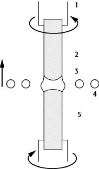 Fließzonentechnik: Vertikales Zonenschmelzverfahren, an der oberne Aufhängung (1) befindet sich das polykristalline Ausgangsmaterial (2), in der Mitte befinden sich die Schmelze (3) und die Hochfrequenzheizung (4), unten wächst der reine Einkristall (5).