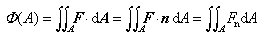 Fluß, Φ, für eine gegebene (offene oder geschlossene) Fläche A das Integral der Normalkomponente eines VektorfeldesF über diese Fläche: