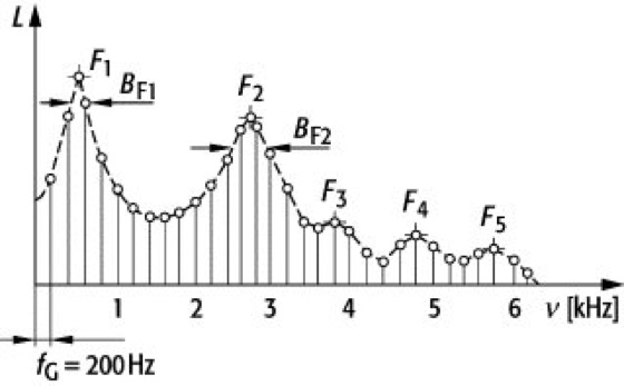 Formant, in der musikalischen Akustik und in der Phonetik ein Bereich im Klangspektrum, in dem sich unabhängig von der Tonhöhe Schallenergie konzentriert. Formanten entstehen durch Resonanzen bei der Schallerzeugung bzw. -übertragung. Sie treten als Erhöhungen in einem sonst gleichmäßigen oder gleichmäßig abklingenden Spektrum in Erscheinung. (Energieminima werden gelegentlich als Anti-Formanten bezeichnet.) Beim Sprechen ist besonders die Ausbildung von zwei Formanten im Frequenzbereich von 0,2 bis 3 kHz (Abb.) für die Erkennung der Vokale verantwortlich. Im Klang von Musikinstrumenten wird durch Formanten eine für das Instrument typische vokalähnliche Klangfarbe gebildet. Wenn in einer elektroakustischen Übertragungsanlage (Elektroakustik) zusätzliche Formanten entstehen, kann die Klangfarbe des übertragenen Schallereignisses stark verfälscht werden.