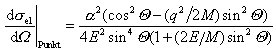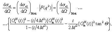 mit E: Energie des einfallenden Elektrons im Ruhesystem (Laborsystem) des Nukleons, θ = 2Θ: Streuwinkel, M: Nukleonmasse, α: Feinstrukturkonstante. Für den Fall des Verschwindens des Quadrates des Impulsübertrages t = -q2 = 4EE'sin2Θ (t heißt auch Mandelstamsche Variable), wobei E' die Energie des gestreuten Elektrons ist, erhält man den Mottschen Streuquerschnitt (dσel / dΩ)Mott. Der Übergang zu einem Nukleon mit ausgedehnter Ladungsverteilung führt unter Ausnutzung der Lorentz-Invarianz und der Eichinvarianz der Streuamplitude auf die elektromagnetischen Formfaktoren Ge und Gm, man erhält dann die Rosenbluth-Formel (N.M. Rosenbluth, 1950):