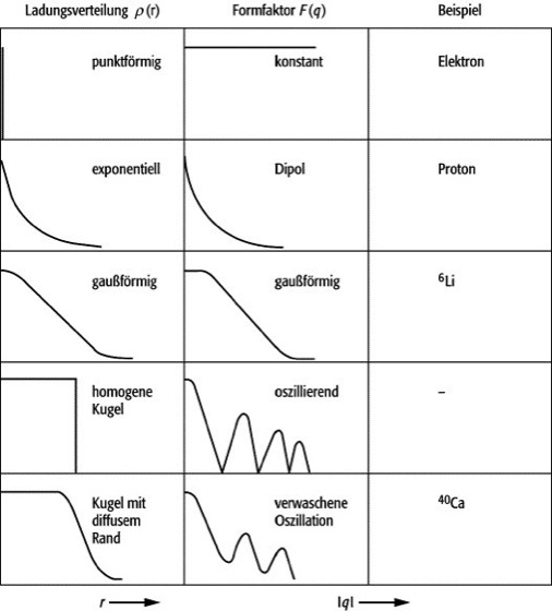 Formfaktor 1: Beispiele für Ladungsverteilung ρ(r) und zugehörigen Formfaktor F(r).