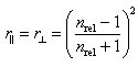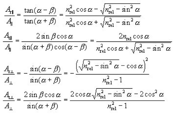 Die Größen r|| und r werden auch als Reflexionskoeffizienten bezeichnet. Für senkrechten Einfall gibt es keinen Unterschied in den Polarisationsrichtungen, und die Fresnelschen Formeln vereinfachen sich zu: