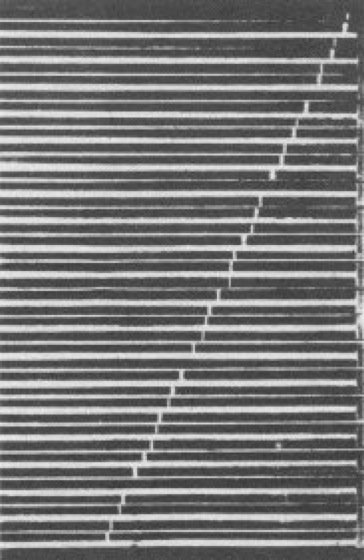 Funkenkammer: Spur eines Höhenstrahlungsmyons in einer Vielplatten-Funkenkammer.